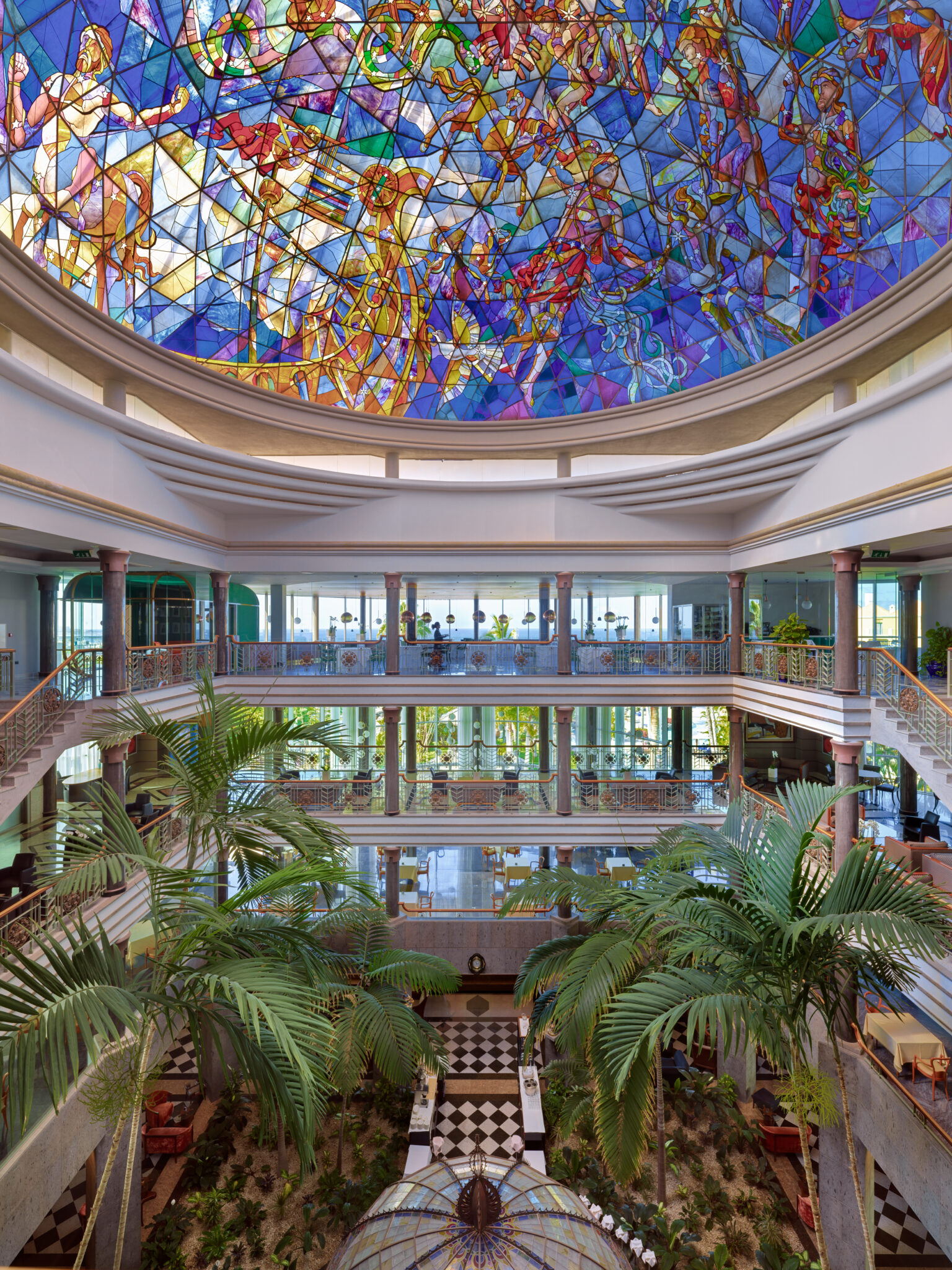 Une fresque monumentale donne immédiatement le ton en happant l’observateur dans un univers où la nature domine. Le restaurant quant à lui affiche une architecture Art déco, tandis qu’un dôme panoramique vitré invite la lumière à chaque heure du jour et de la nuit. Grâce à ces éléments inhabituels, l’expérience culinaire se vit entre ciel et océan.